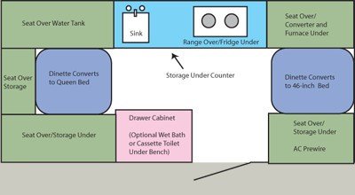 The Arrowhead features a gaucho-style couch at one end and dinette at the other, both converting to beds. Besides the huge list of standard features, the Arrowhead also includes two 22 x 22 skylights, a rear baggage door and a larger water tank.