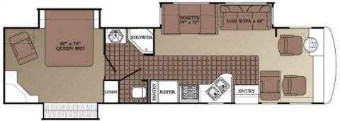 The RV for sale is a New 3905 Georgie Boy Cruise Master Class A Gas by Georgie Boy RV that is room enough for 6 RV-ers to sleep, is equipped with a tough fiberglass construction type, and has 3 spacious slides.