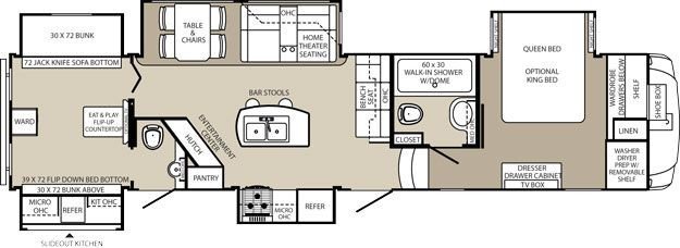 The larger (26- to 40-foot) fifth-wheel models are the hot setup for anyone seeking maximum living space -- the RV of choice for full-time living. Most include up to three large slideouts and standing room in the front bedroom; the larger models are available with a wide range of appliances, including built-in washer/ dryer, dishwasher and entertainment center with surround sound.