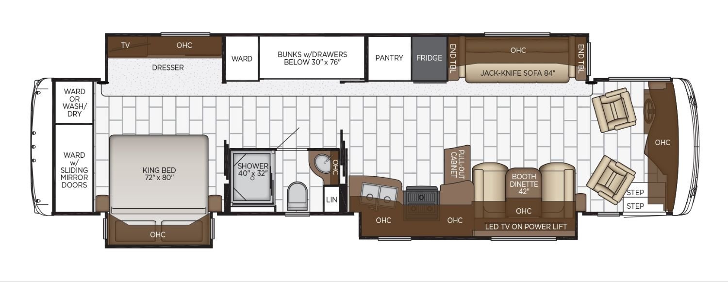 This Ventana Le Class A Diesel weighs 30166 (dry), has only 1269 miles, is in great condition has a "4045" floorplan, and is available to you at your family RV dealer Ponchatoula in Ponchatoula, LA.