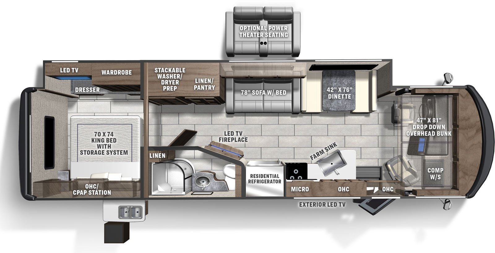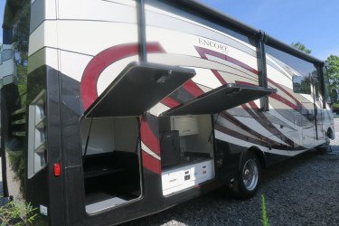 This Encore Standard Class A Gas has only 1120 miles, is in great condition weighs 17793 (dry), is 35ft 4in long, has a "325ss" floorplan, and is available to you at your family RV dealer Ponchatoula in Ponchatoula, LA.