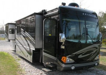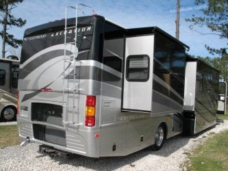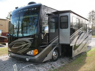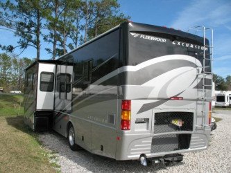 The RV for sale is a New 3907 Fleetwood Excursion Class A Gas by Fleetwood RV that is room enough for 3 RV-ers to sleep, has Freightliner chassis,is equipped with a tough fiberglass construction type, and has 4 spacious slides.