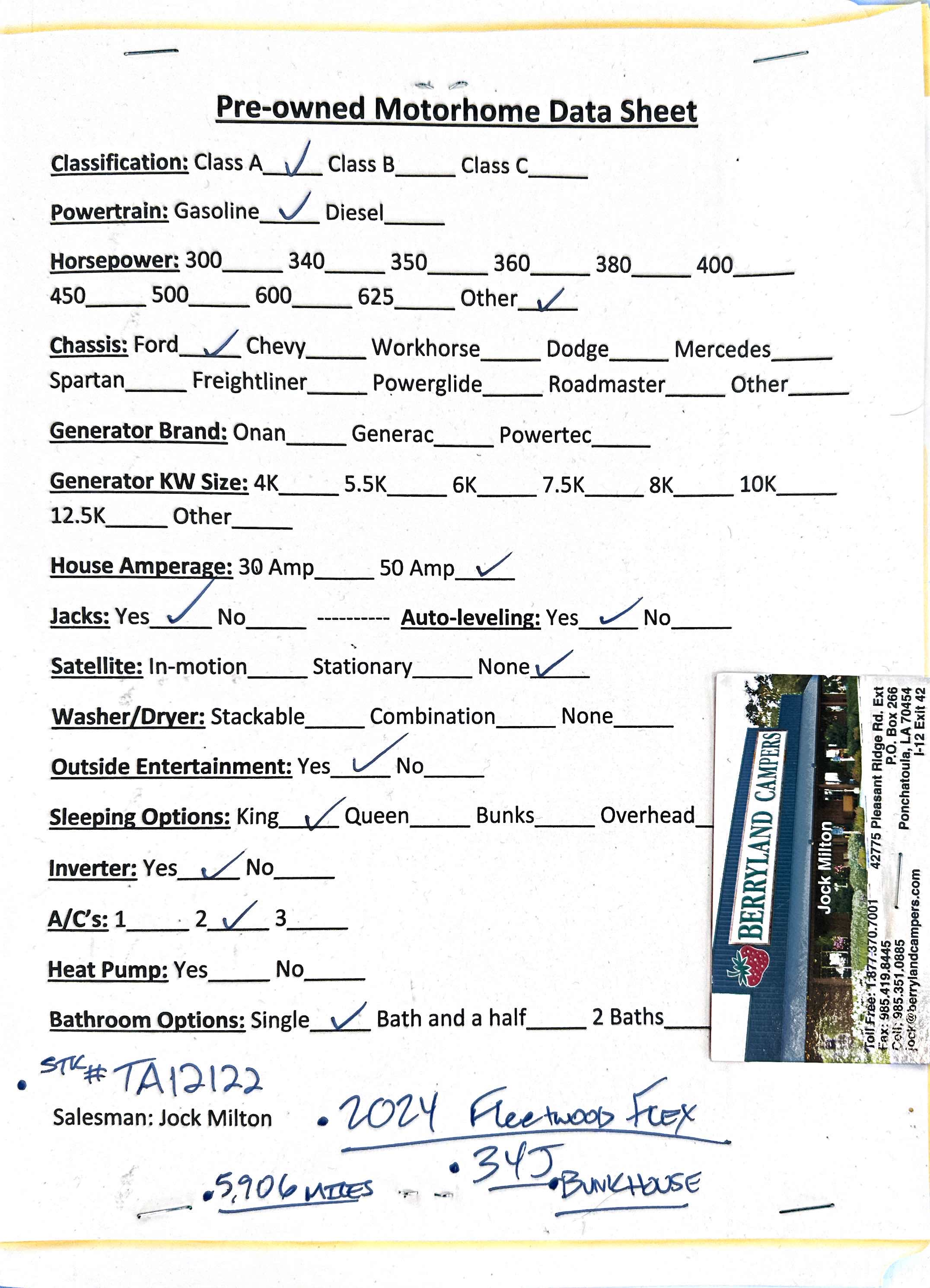 UNIT SPECIALIST Call 1-(985) 370-7001 and ask for Jock M, the specialist on this Fleetwood Flex for sale. Ask about the Class A Gas RV for sale with a stock # TA12122.