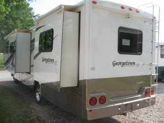 The RV for sale is a Used 3908 Forest River Georgetown Class A Gas by Forest River RV that has Ford chassis,is room enough for 8 RV-ers to sleep, is equipped with a tough fiberglass construction type, and has 3 spacious slides.