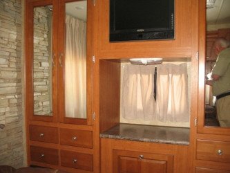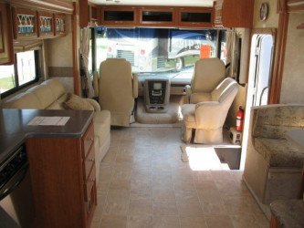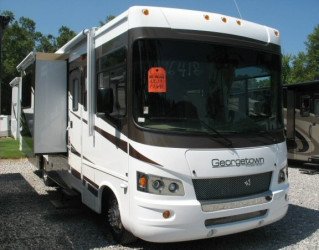 The RV for sale is a New 3910 Forest River Georgetown Class A Gas by Forest River RV that is equipped with a tough fiberglass construction type, is room enough for 6 RV-ers to sleep, has Ford chassis,and has 3 spacious slides.