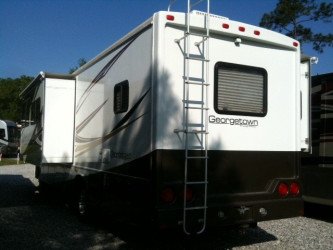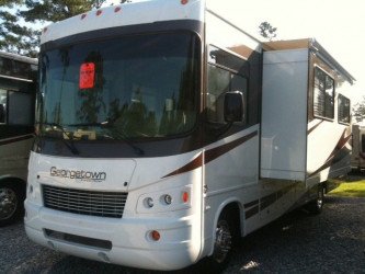 The RV for sale is a New 3911 Forest River Georgetown Class A Gas by Forest River RV that is equipped with a tough fiberglass construction type, is room enough for 6 RV-ers to sleep, has Ford chassis,and has 3 spacious slides.