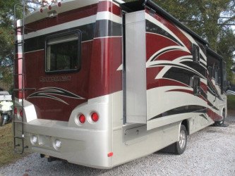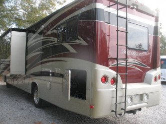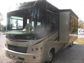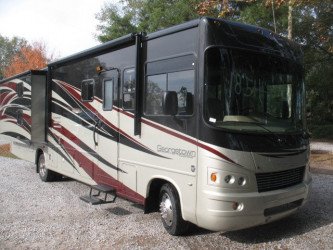 The RV for sale is a New 3912 Forest River Georgetown Class A Gas by Forest River RV that is equipped with a tough fiberglass construction type, has Ford chassis,is room enough for 8 RV-ers to sleep, and has 2 spacious slides.