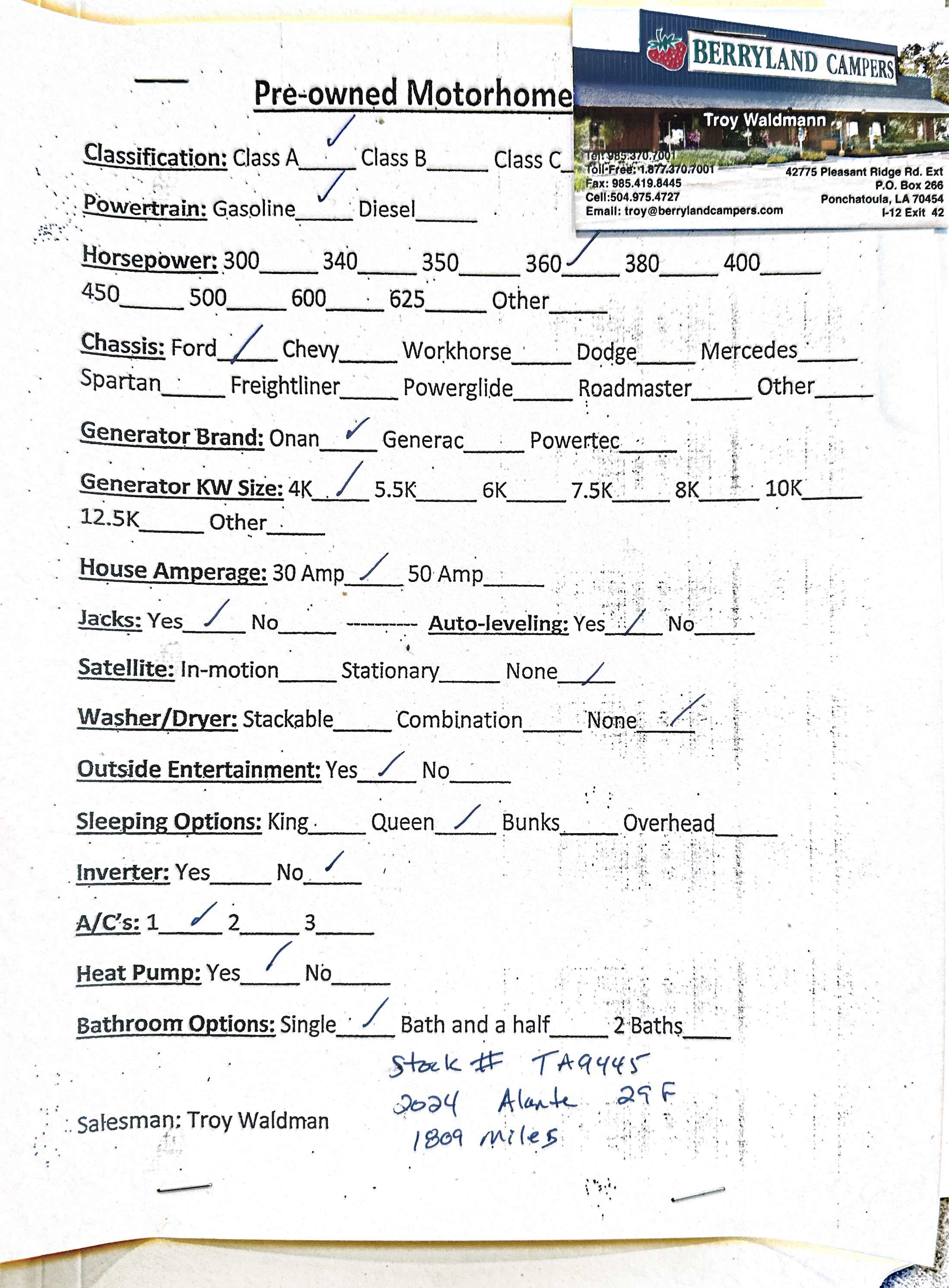 This Alante 29f Class A Gas is 32ft 0in long, has only 1809 miles, has a "29f" floorplan, runs on gas, is in great condition and is available to you at your family RV dealer Ponchatoula in Ponchatoula, LA.