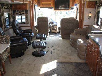 If you're looking for the ultimate in comfort while on the road, then the Class A Motorhome is for you. It has all the amenities of home in a self-contained unit. With features like a big refrigerator, oven/microwave, TV/VCR (2 in most units), satellite dish, bath facilities, bigger batteries, large water and holding tanks, generous propane supply, on-board generator and ample living space, the livability of a larger Class A is exceptional. These features also make these units especially good for "dry" camping, where hookups are not available.