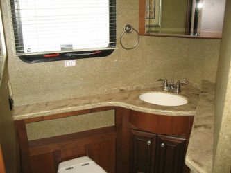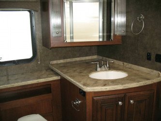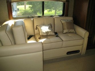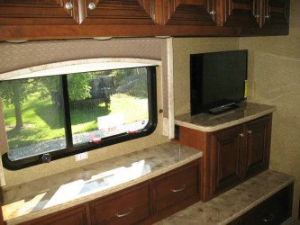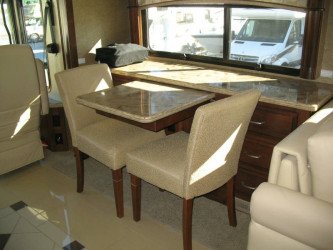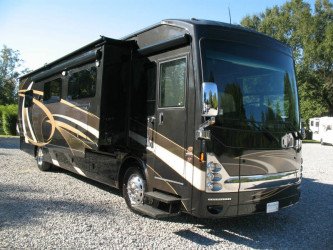 The RV for sale is a New 3914 Thor Tuscany Class A Gas by Thor RV that is equipped with a tough fiberglass construction type, has Freightliner chassis,is room enough for 6 RV-ers to sleep, and has 3 spacious slides.