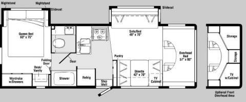 The RV for sale is a New 3906 Itasca By Winnebago Spirit Class C by Itasca By Winnebago RV that is room enough for 4 RV-ers to sleep, is equipped with a tough fiberglass construction type, has Ford chassis,and has 2 spacious slides.