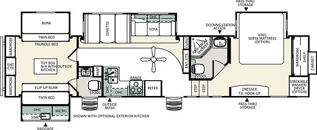 The larger (26- to 40-foot) fifth-wheel models are the hot setup for anyone seeking maximum living space -- the RV of choice for full-time living. Most include up to three large slideouts and standing room in the front bedroom; the larger models are available with a wide range of appliances, including built-in washer/ dryer, dishwasher and entertainment center with surround sound.