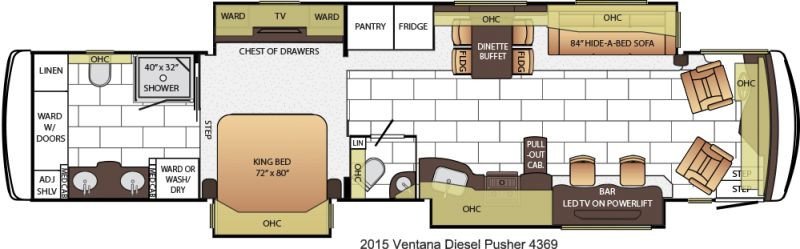This Newmar Ventana Class A Gas has a "4369" floorplan, is brand new, runs on diesel, and is available to you at your family RV dealer Ponchatoula in Ponchatoula, LA.