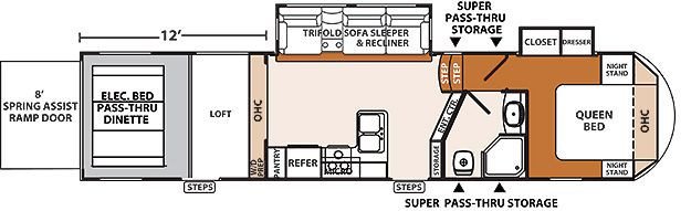 SURV stands for sport-utility RV. This is the new craze in RVing because it allows you and your "toys" to travel to your favourite off-road destinations without leaving behind the comforts of home. Beds, dinettes and couches are typically designed to fold up against interior walls to maximize rear cargo space. But what distinguishes an SURV from other trailers or towable RVs is a swing-down ramp and enough cargo space for a variety of off-road vehicles such as ATVs, dirt bikes, jet skis, canoes, snowmobiles or motorcycles.