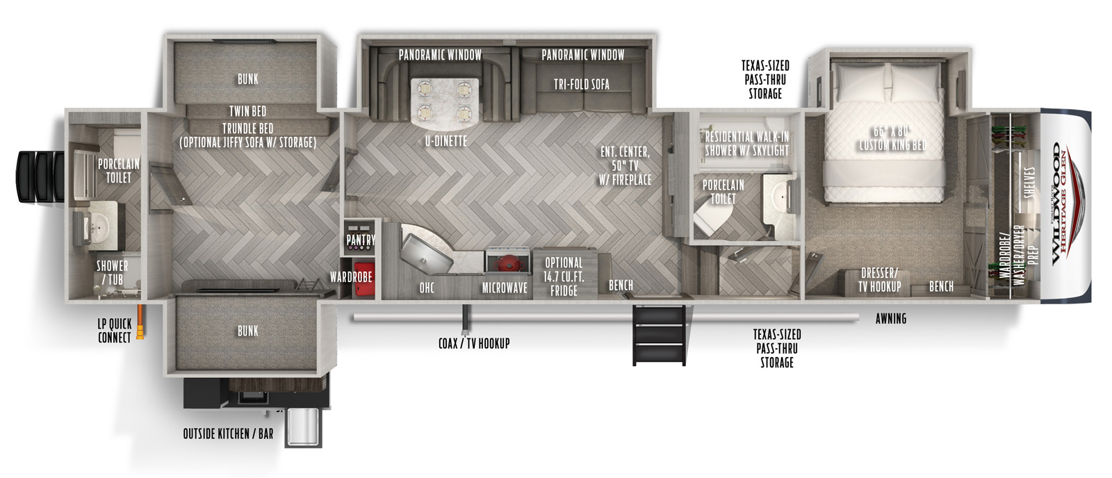 This Wildwood Heritage Glen Ltz Fifth Wheel has a "356qb" floorplan, is in great condition weighs 11190 (dry), is 43ft 0in long, and is available to you at your family RV dealer Ponchatoula in Ponchatoula, LA.
