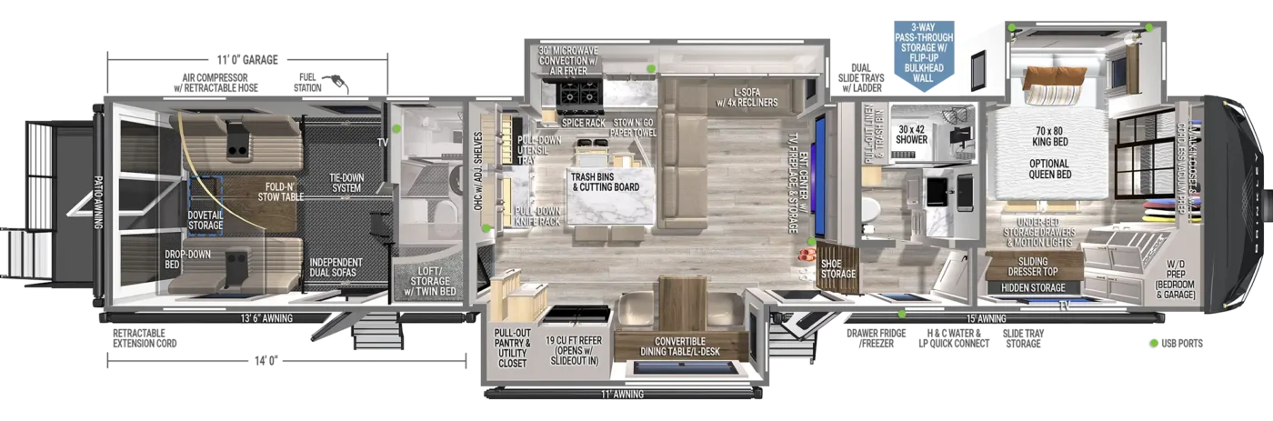 This Brinkley Model G Fifth Wheel weighs 19270 (dry), is in great condition is 45ft 5in long, has a "3970" floorplan, and is available to you at your family RV dealer Ponchatoula in Ponchatoula, LA.
