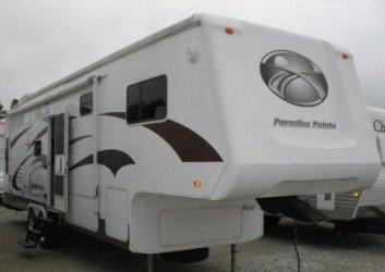 The RV for sale is a Used 3905 Crossroads Rv Paradise Pointe Fifth Wheel by Crossroads Rv RV that is room enough for 6 RV-ers to sleep, is equipped with a tough fiberglass construction type, and has a slide.