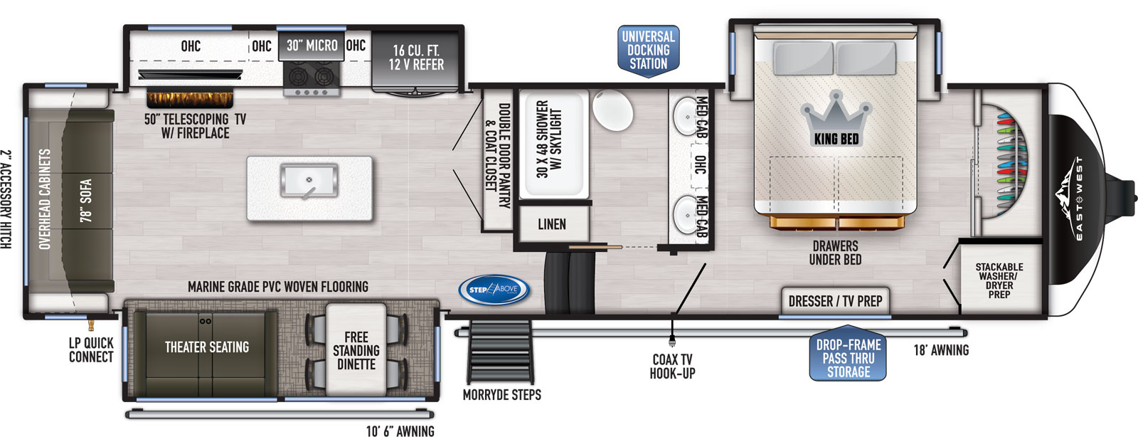 The RV for sale is a New 2022 Ahara 365rl Fifth Wheel by East To West RV that and has a slide.
