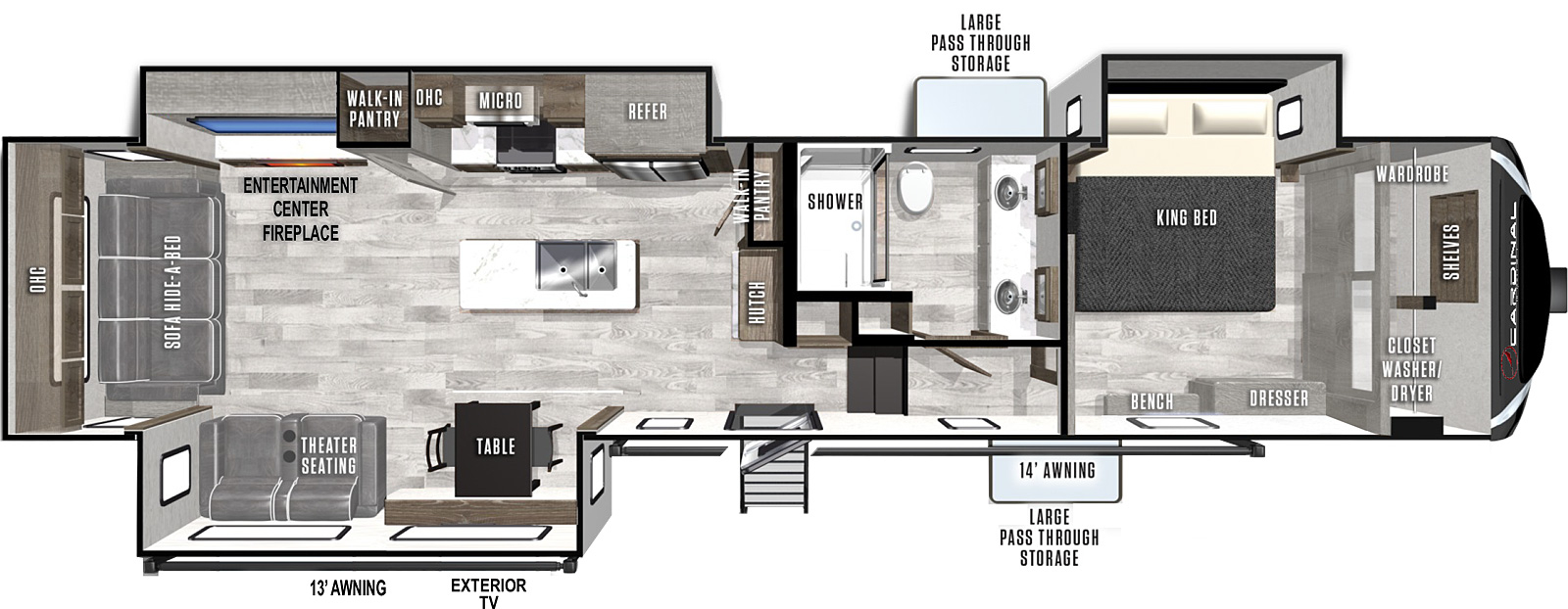 This Cardinal Luxury Fifth Wheel has a "360rlx" floorplan, is 41ft 9in long, is in great condition weighs 11980 (dry), and is available to you at your family RV dealer Ponchatoula in Ponchatoula, LA.