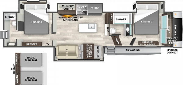 Fifth Wheels also offer many of the amenities you will find in a larger motorhome. Our Fifth Wheels include a full kitchen area, dining, several sleeping areas, a full bathroom, and plenty of storage. Fifth Wheel campers also come equipped with an entertainment center to enjoy movie nights with the family. Camping for extended periods will be infinitely more comfortable and relaxed, especially when traveling with children. With a Fifth Wheel camper, you can comfortably take a break from the great outdoors. Preparing meals will be easier since the Fifth Wheels come with a full kitchen—no need to worry about packing only unperishable foods. You can store everything you need for a full-course meal in the pantry area and the refrigerator. Ample storage areas allow you to pack for long trips without taking up your living space.