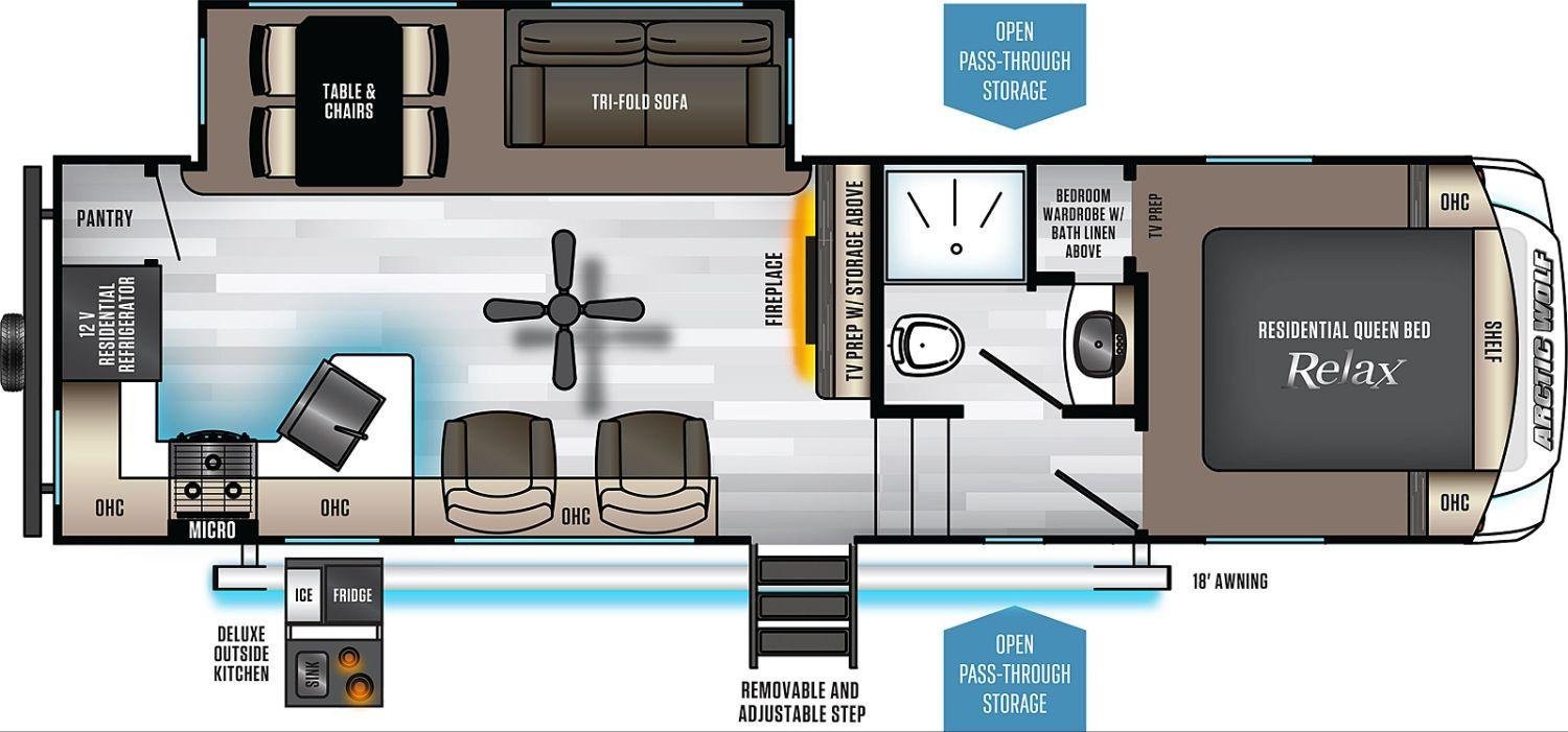 This Cherokee Arctic Wolf Fifth Wheel weighs 7770 (dry), has a "271rk" floorplan, is 30ft 9in long, is in great condition and is available to you at your family RV dealer Ponchatoula in Ponchatoula, LA.