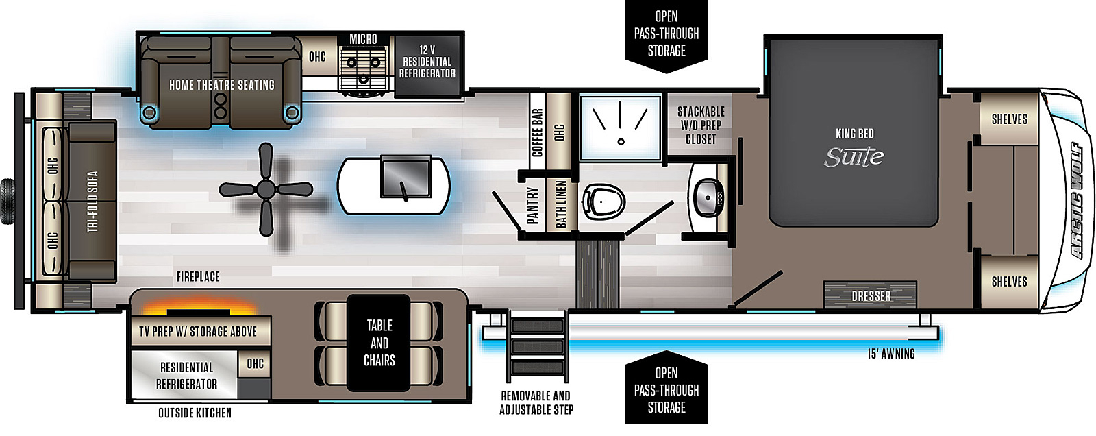 This Cherokee Arctic Wolf Fifth Wheel is 37ft 7in long, has a "3550suite" floorplan, weighs 9530 (dry), is in great condition and is available to you at your family RV dealer Ponchatoula in Ponchatoula, LA.