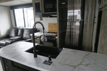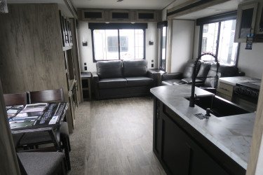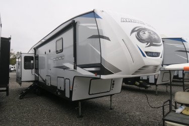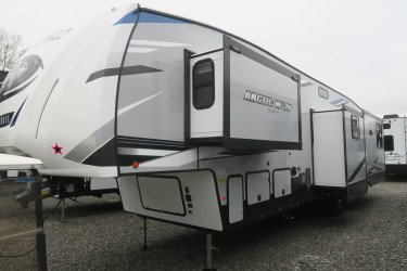 The RV for sale is a New 2021 Cherokee Arctic Wolf Fifth Wheel by Forest River RV that and has 4 spacious slides.