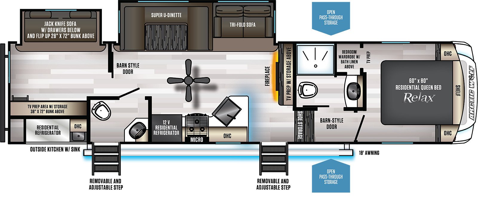 This Cherokee Arctic Wolf Fifth Wheel is 36ft 0in long, weighs 9250 (dry), has a "321bh" floorplan, is in great condition and is available to you at your family RV dealer Ponchatoula in Ponchatoula, LA.