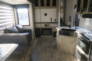 The RV for sale is a New 2021 Cherokee Arctic Wolf Fifth Wheel by Forest River RV that and has a slide.