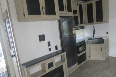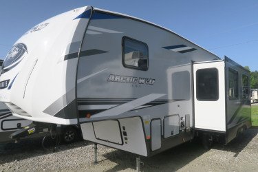 The RV for sale is a New 2021 Cherokee Arctic Wolf Fifth Wheel by Forest River RV that and has a slide.