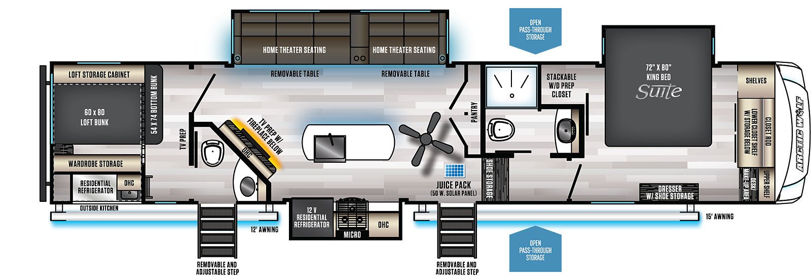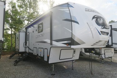 This Cherokee Arctic Wolf Fifth Wheel is in great condition is 43ft 6in long, has a "3770suite" floorplan, weighs 10855 (dry), and is available to you at your family RV dealer Ponchatoula in Ponchatoula, LA.
