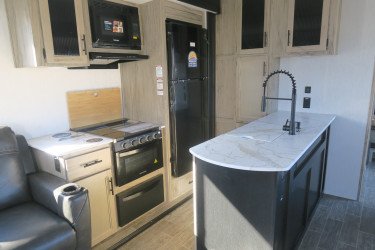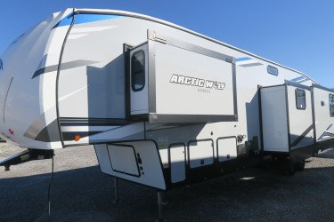 The RV for sale is a New 2022 Cherokee Arctic Wolf Fifth Wheel by Forest River RV that and has a slide.