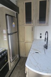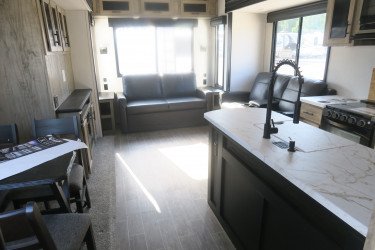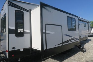 The RV for sale is a New 2022 Cherokee Arctic Wolf Fifth Wheel by Forest River RV that and has a slide.