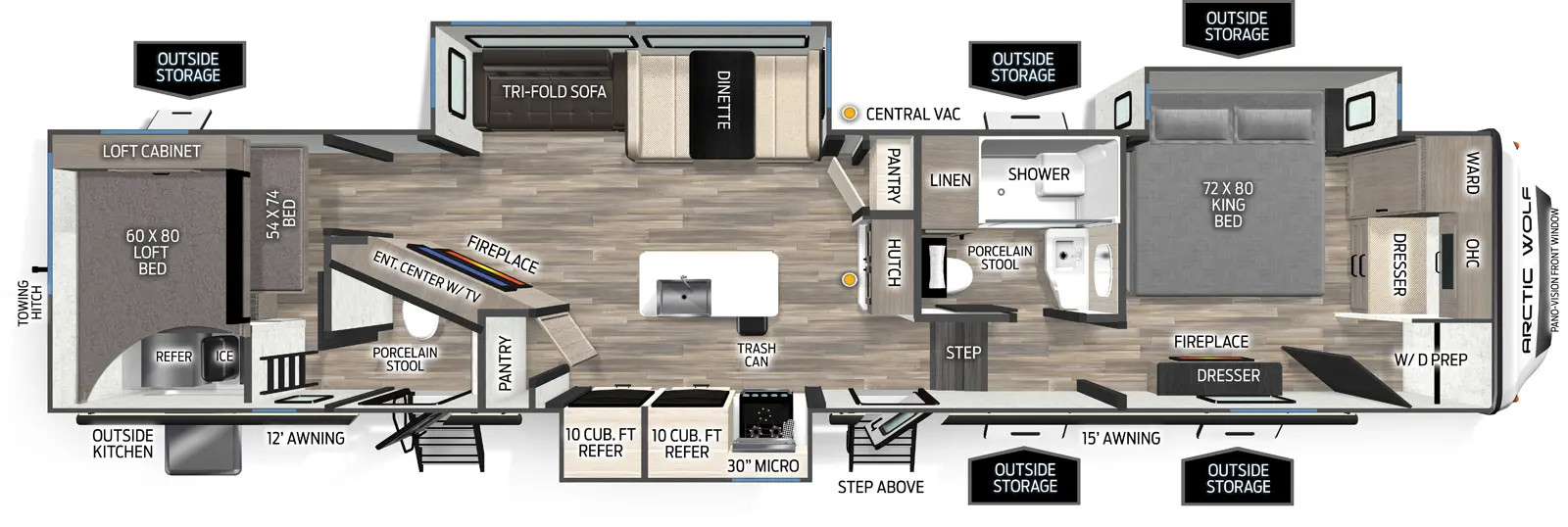 This Cherokee Arctic Wolf Fifth Wheel is 42ft 9in long, has a "3750suite" floorplan, is in great condition weighs 11290 (dry), and is available to you at your family RV dealer Ponchatoula in Ponchatoula, LA.