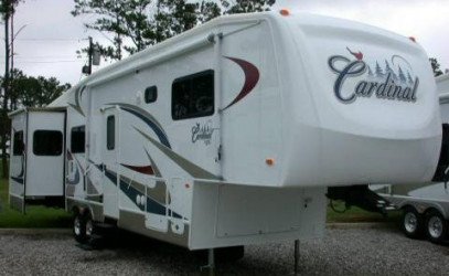 The RV for sale is a New 3907 Forest River Cardinal Fifth Wheel by Forest River RV that is room enough for 4 RV-ers to sleep, is equipped with a tough fiberglass construction type, and has 3 spacious slides.