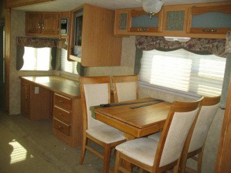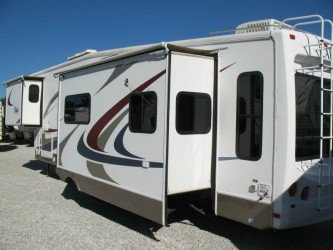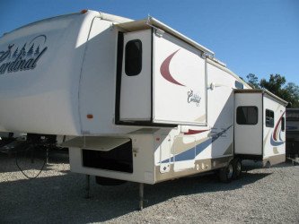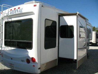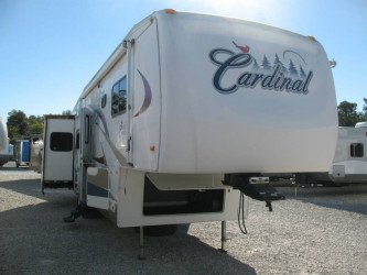The RV for sale is a Used 3906 Forest River Cardinal Fifth Wheel by Forest River RV that is equipped with a tough fiberglass construction type, is room enough for 6 RV-ers to sleep, and has 3 spacious slides.