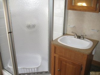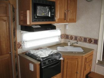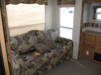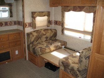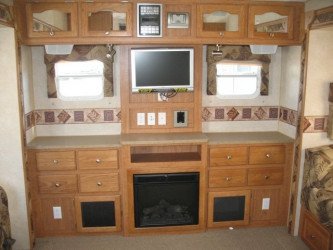 The RV for sale is a New 3909 Forest River Flagstaff Fifth Wheel by Forest River RV that is equipped with a tough fiberglass construction type, is room enough for 6 RV-ers to sleep, and has 2 spacious slides.