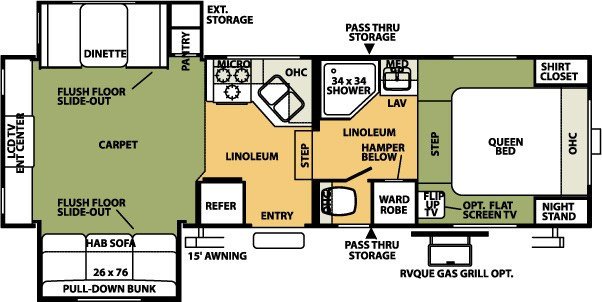 Designed to be affixed and towed by a pickup truck equipped with a special hitch in the truck bed. The unique bi-level design raises the master bedroom over the truck bed, and often has a large picture window at the rear. These RVs have great living quarters, often with slideout options, plus all the comforts of home.