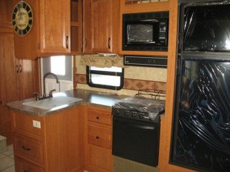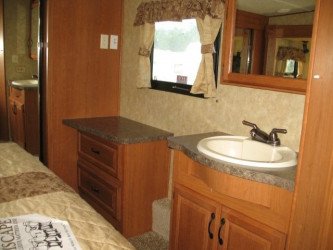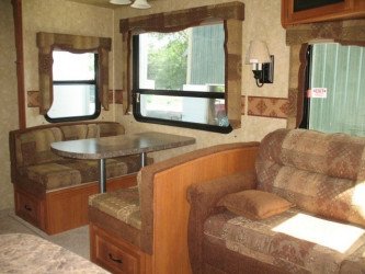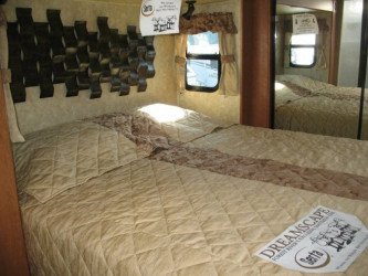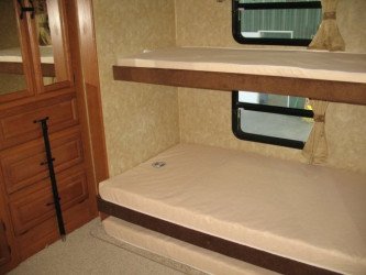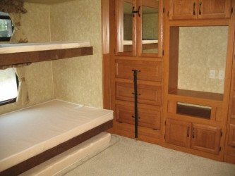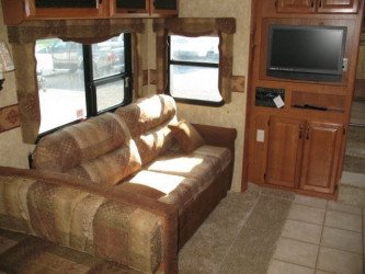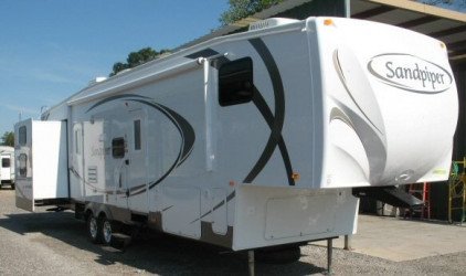 The RV for sale is a New 3910 Forest River Sandpiper Fifth Wheel by Forest River RV that is equipped with a tough fiberglass construction type, is room enough for 8 RV-ers to sleep, and has 4 spacious slides.