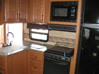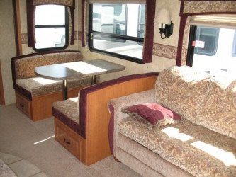 The RV for sale is a New 3909 Forest River Sierra Fifth Wheel by Forest River RV that is equipped with a tough fiberglass construction type, is room enough for 8 RV-ers to sleep, and has 4 spacious slides.