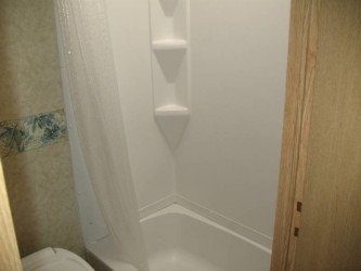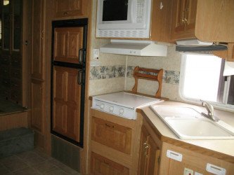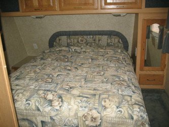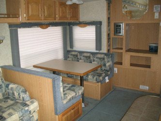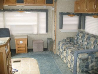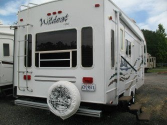 The RV for sale is a Used 3905 Forest River Wildcat Fifth Wheel by Forest River RV that is room enough for 6 RV-ers to sleep, is equipped with a tough fiberglass construction type, and has a slide.