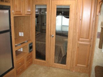 The RV for sale is a New 3908 Forest River Wildcat Fifth Wheel by Forest River RV that is room enough for 8 RV-ers to sleep, is equipped with a tough fiberglass construction type, and has 2 spacious slides.