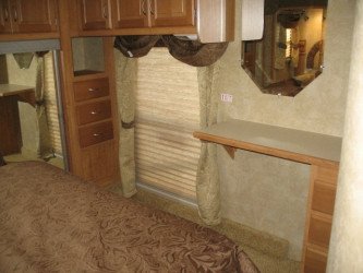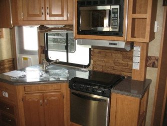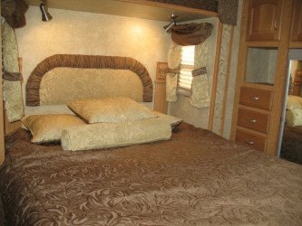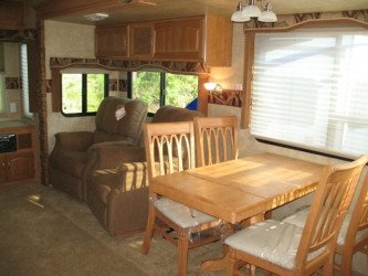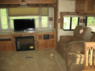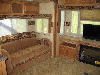 The RV for sale is a New 3910 Forest River Wildcat Fifth Wheel by Forest River RV that is room enough for 6 RV-ers to sleep, is equipped with a tough fiberglass construction type, and has 3 spacious slides.