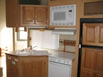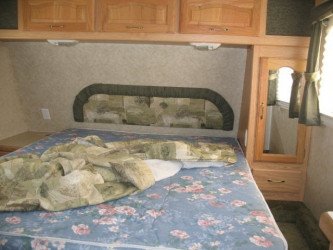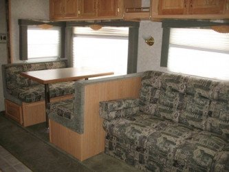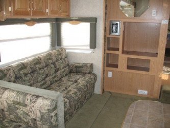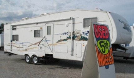 The RV for sale is a Used 3905 Forest River Wildcat Fifth Wheel by Forest River RV that is room enough for 8 RV-ers to sleep, is equipped with a tough fiberglass construction type, and has a slide.