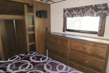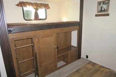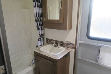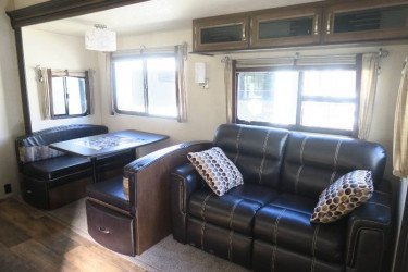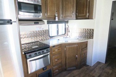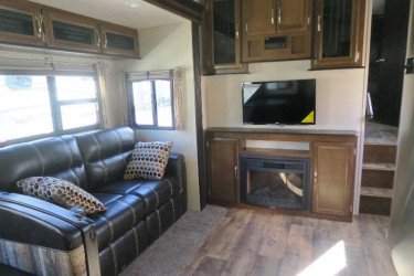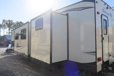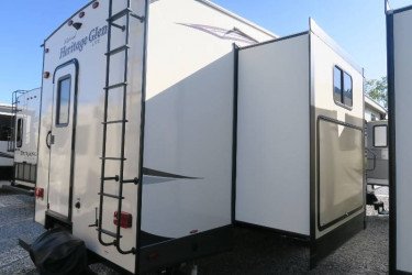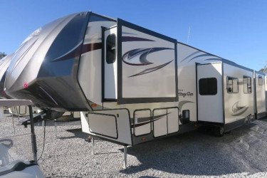 The RV for sale is a New 3917 Forest River Wildwood Fifth Wheel by Forest River RV that is room enough for 8 RV-ers to sleep, is equipped with a tough fiberglass construction type, and has 4 spacious slides.