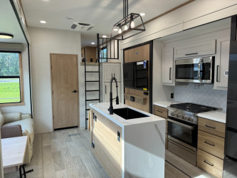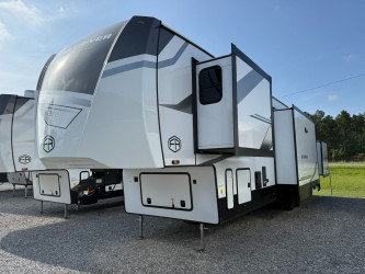 This Sandpiper 4002fb Fifth Wheel has a "4002fb" floorplan, is 43ft 5in long, weighs 12830 (dry), is in great condition and is available to you at your family RV dealer Holden in Holden, LA.