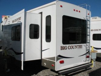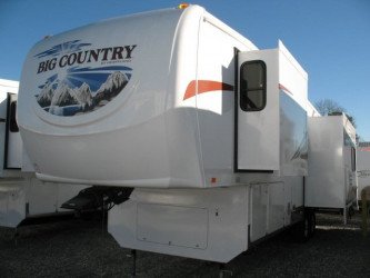 The RV for sale is a New 3908 Heartland Big Country Fifth Wheel by Heartland RV that is equipped with a tough fiberglass construction type, is room enough for 6 RV-ers to sleep, and has 3 spacious slides.