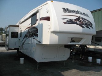 The RV for sale is a Used 3908 Keystone Montana Fifth Wheel by Keystone RV that is equipped with a tough fiberglass construction type, is room enough for 6 RV-ers to sleep, and has 3 spacious slides.