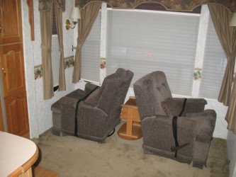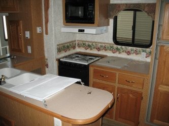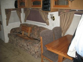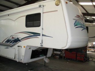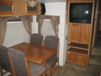The RV for sale is a Used 3902 Keystone Montana Fifth Wheel by Keystone RV that is equipped with a tough fiberglass construction type, is room enough for 6 RV-ers to sleep, and has 2 spacious slides.
