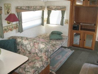 The RV for sale is a Used 3903 Keystone Sprindale Fifth Wheel by Keystone RV that is room enough for 8 RV-ers to sleep, is equipped with a tough aluminum construction type, and has a slide.